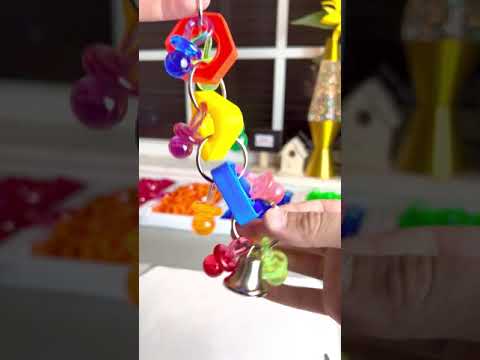 The top of the bird toy includes a fast link connector for easy hanging in the aviary. From here the connector loops through the uppermost sturdy metal ring, There are (3) more of these metal rings on the toy as they connect and interspace the plastic screw nuts. Also adorning each metal rings are (2) colorful translucent acrylic pacifiers. These pacifiers are beautiful to look at and great fun for pets to investigate with their beaks and feet. The large screw nuts are colorful, have smooth interesting sides and are easy for pets to manipulate. Hanging from the bottom ring in between the pacifiers is a metal bell that makes great bird pleasing sounds when played with.