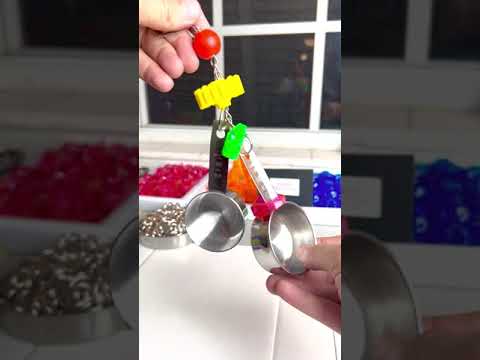 This toy includes a fast link connector at the top for easy hanging in the aviary. From here the connector loops through the last link in a sturdy link chain that runs through the toy. This link chain has been adorned with a colorful plastic bead and a colorful plastic foot gear. These items are great fun for pets to manipulate and move around on the chain. On the bottom of the chain link there are (2) sturdy metal rings. Both of the sturdy metal rings have stainless steel measuring pots dangling. One of the stainless steel measuring pots has been adorned with (1) colorful acrylic ring while the other measuring pot has been adorned with (2) colorful acrylic rings. These beautiful rings reflect their colors onto the stainless steel pots making a bird enticing effect.