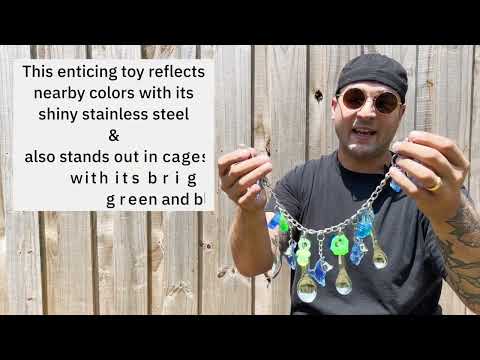 This bird toy has (2) heavy duty quick link connectors with one at either end of the sturdy link chain backbone. These heavy duty link connectors are perfect for all the pulling action this toy will create! The heavy duty quick link connects loops through sturdy metal rings that have each been adorned with a diving dolphin. Hanging from the metal ring is a smaller metal ring with an adorable translucent acrylic dolphin hanging and a small sized metal bell. These dolphins sit loosely in the ring and are super entertaining for pet birds to manipulate with their beaks and feet.