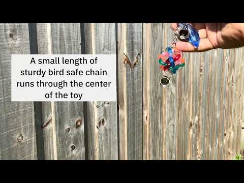 This small sized toy has bird enticing bright and shiny parts. As all the pieces dangle from the center link chain, anytime your pet plays with the toy it will move all about. The (3) small metal bells on the toy make bird pleasing sounds whenever the toy moves. With its bright colors, shiny materials and ease of install this small bird toy is perfect for small sized cages and aviaries.