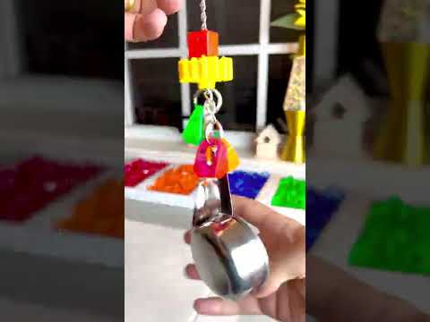 This toy has its stainless steel measuring spoon and pot in the perfect position to make noise! Either object can be grabbed by your pet and bumped against the other for a bird pleasing time. The shiny stainless steel reflects the colorful acrylic ring colors for an enticing effect. As the toy hangs from a link chain it will move all about when your pet interacts with it. A compact durable noise making handmade bird toy, perfect for cages of all types.