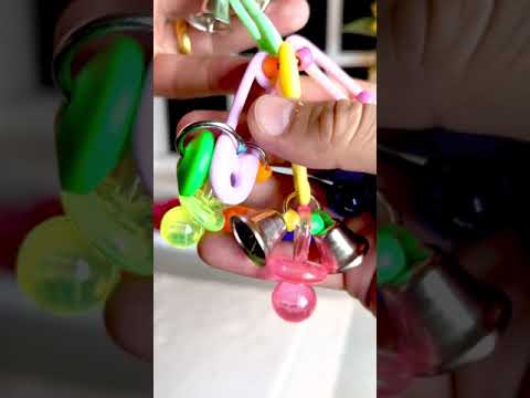 The top of the bird toy includes a small sized quick link connector for fast hanging in the aviary. This connector loops through a small metal ring that itself is adorned with colorful plastic beads and (2) small metal bells. This metal ring loops through the a hole in the end of a colorful plastic bobbin with (4) bobbins hanging on the toy total. The middle of the toys body is a metal ring that hangs the other (3) plastic bobbins and also has (2) colorful plastic beads on it. On the bobbins on the left and right are (2) metal rings, each with (2) colorful plastic beads, a colorful plastic shape and a beautiful translucent acrylic pacifier. The colorful bobbin in the middle of the toy has a small metal ring on the bottom that has (2) colorful plastic beads, (2) small metal bells and a single acrylic pacifier dangling.