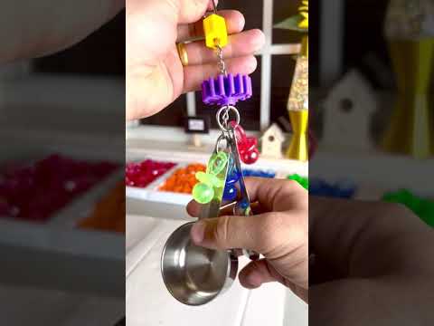 At the top of the bird toy there is a quick link connector for fast hanging in the aviary. From here the connector loops through the end of a small link chain which dangles down through the center of the toy. This chain is adorned with a colorful plastic bead and colorful foot gear piece. These parts sit on top of a small metal ring which dangles a stainless steel measuring spoon and beautiful acrylic pacifier. The chain continues down and ends with another small sturdy metal ring that has (2) additional beautiful pacifiers and a stainless steel measuring pot.