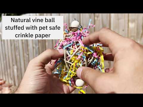 This handmade bird toy is 100% bird safe and varies slightly in shape and size as the vine ball body is completely natural.