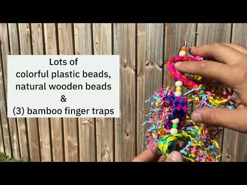 This bird safe handmade toy ships in bright assorted colors for the finger traps, shred paper and plastic beads.